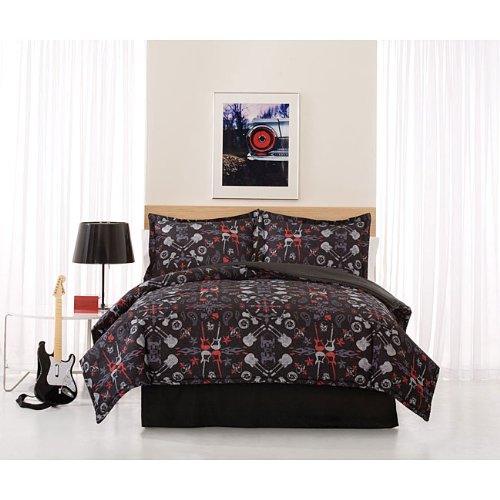 Comforter,2 usual pillow shams.Bedding options an allover guitar print in crimson, gentle gray and dark grey on a black history.Very mild comforter...perfect for summer season...